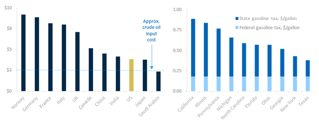 Europe has higher fuel taxes as governments prioritize energy conservation, which leads to higher electric vehicle market share and reduced overall auto ownership. By contrast, the US federal gasoline tax hasn’t increased since 1993. At the bottom end of the price spectrum are some of the Organization of the Petroleum Exporting Countries, where gasoline is sometimes priced below the input cost of crude. On the domestic front, gas prices can vary widely by state with differences driven by state‑level taxes.