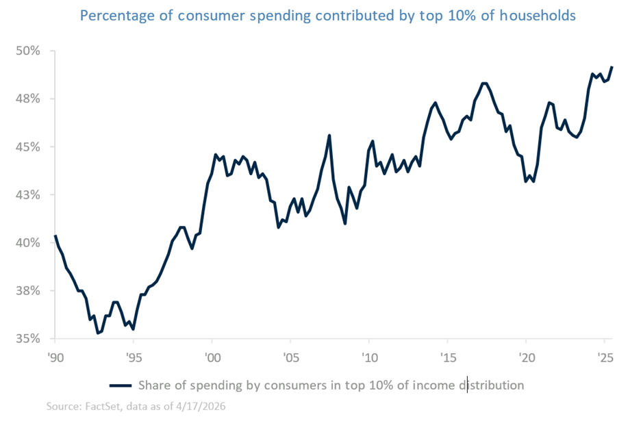 The growing divide between income groups is contributing to a more concentrated pattern of consumer spending, with a larger share driven by higher-income households. As a result, overall economic activity becomes increasingly dependent on a smaller segment of consumers, many of whom are more sensitive to changes in asset prices and financial market conditions. Currently, it is estimated that the top 10% of households generate nearly 50% of all spending, which translates to about one-third of US GDP. If this group pulls back spending due to equity market volatility or a significant market correction, the effects can ripple more broadly across the economy. This dynamic also has labor market implications, as lower-income households are often employed in sectors that depend on discretionary spending from higher-income consumers.
